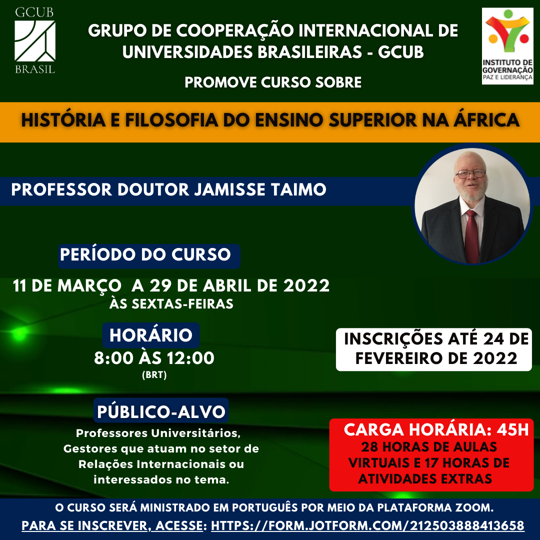 O Núcleo de Internacionalização do Instituto IPÊ informa que as inscrições para o Curso História e Filosofia do Ensino Superior na África, a ser ministrado pelo Professor Doutor Jamisse Taimo, se encerram em 24 de fevereiro de 2022.