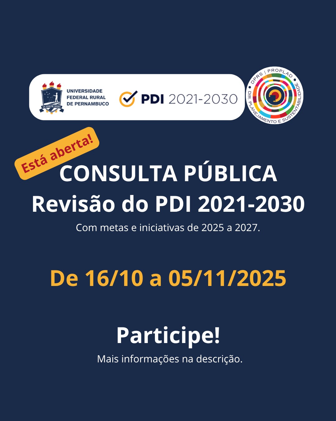 Está aberta a etapa da Consulta Pública sobre a revisão do Plano de Desenvolvimento Institucional (PDI) 2021-2030, com foco nas metas e iniciativas previstas para o período de 2025 a 2027.