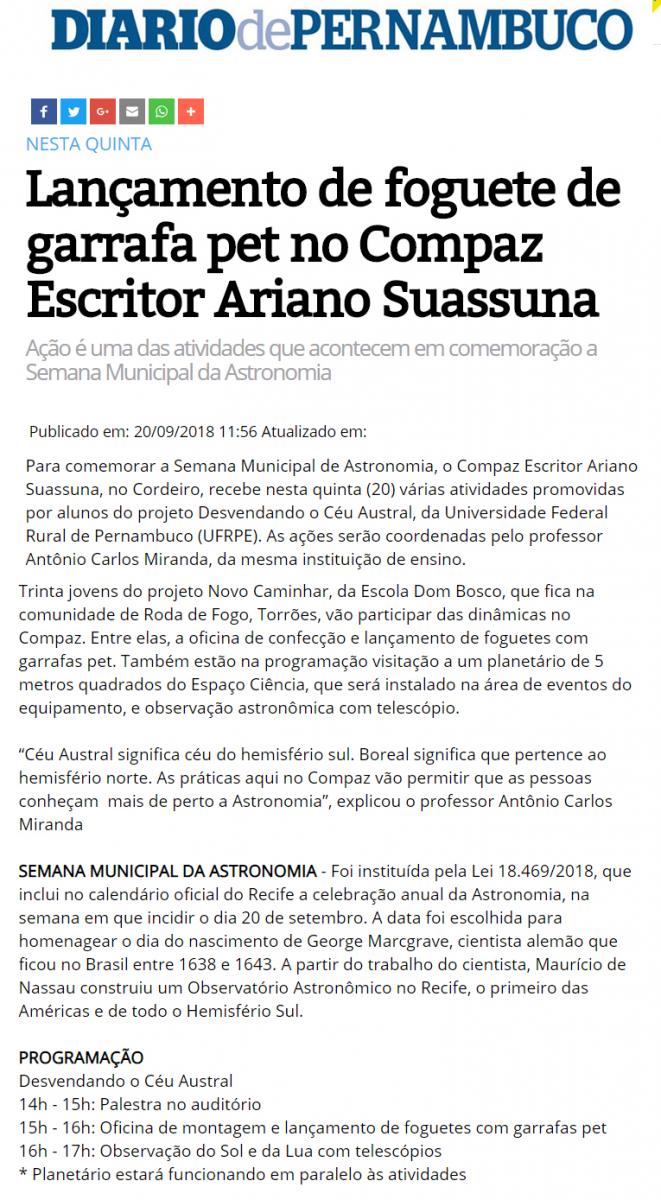 [DIÁRIO DE PERNAMBUCO] Lançamento de foguete de garrafa pet no Compaz Escritor Ariano Suassuna