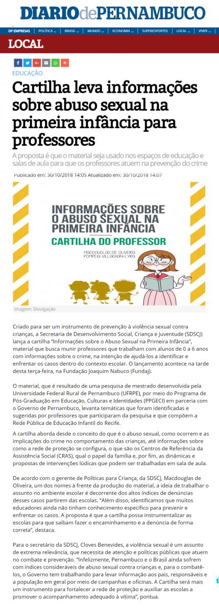 [DIARIO DE PERNAMBUCO] Cartilha leva informações sobre abuso sexual na primeira infância para professores