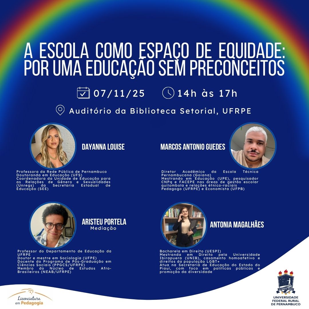 O evento acontecerá no dia 07 de novembro de 2025, das 14h às 17h, no Auditório da Biblioteca Setorial da UFRPE, e tem como objetivo promover uma reflexão sobre gênero, raça e sexualidade na escola, reunindo pesquisadoras e pesquisadores de diferentes áreas. Público alvo: estudantes de licenciatura da Universidade.