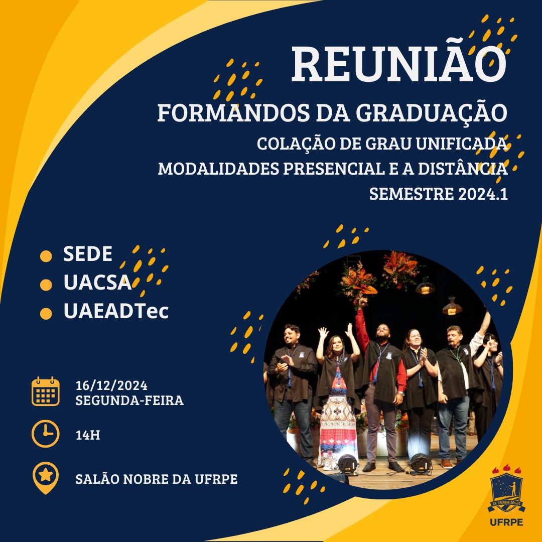 O Cerimonial da UFRPE realiza, na próxima segunda-feira (16/12), reunião com os(as) formandos(as) dos cursos de graduação, modalidades presencial e a distância, para o sorteio das representações dos(as) homenageados(as) para a Colação de Grau Unificada, referente ao semestre 2024.1.
