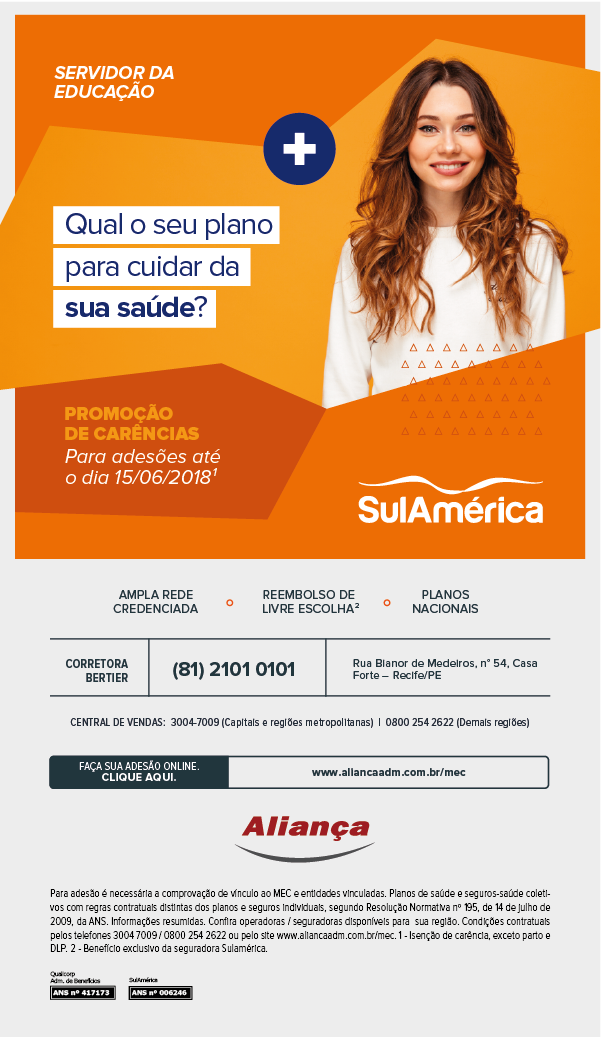 Os servidores da UFRPE podem aderir ao plano de saúde Sulamerica, através da Aliança, com uma promoção de carências até o dia 15/06. É uma promoção para servidores da educação e, por isso, é requisito comprovar o vínculo com o Ministério da Educação.