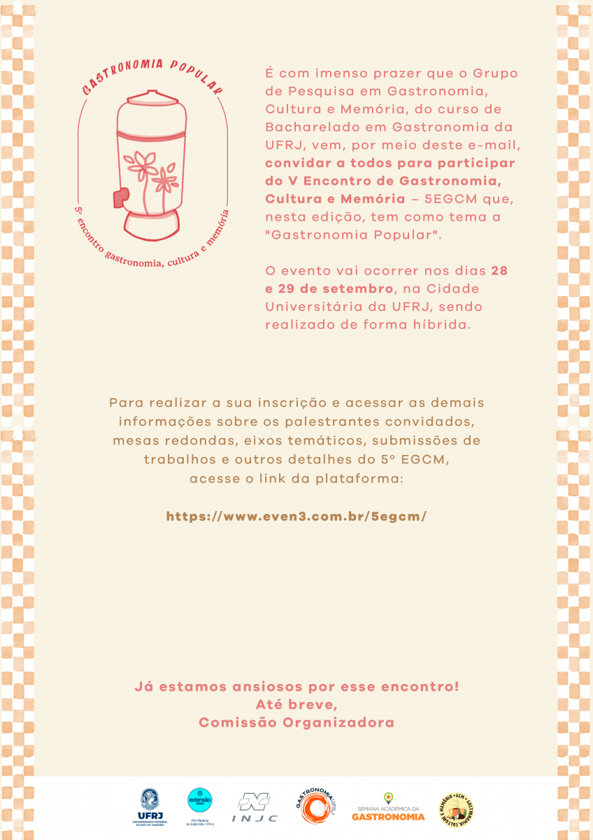O 5º Encontro de Gastronomia, Cultura e Memória será realizado nos dias 28 e 29 de setembro, entre os temas refletidos no evento a “gastronomia popular”, ganhará ênfase durante a programação. As inscrições podem ser realizadas através do site: https://www.even3.com.br/5egcm/, por meio deste endereço, também é possível obter mais informações sobre os eixos temáticos abordados e submissões de trabalhos.