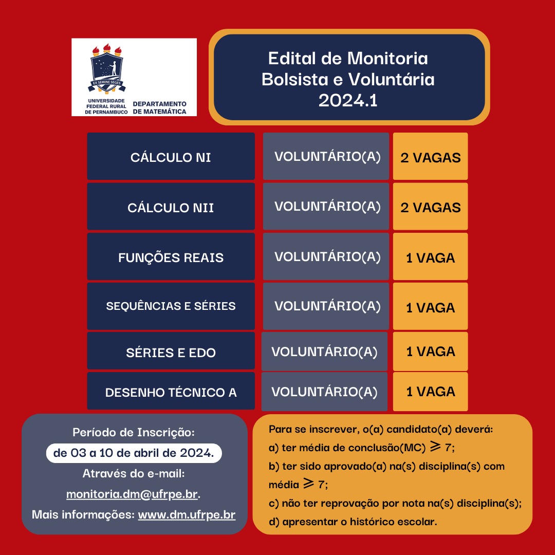 Os interessados devem ficar atentos aos prazos de inscrição, que ocorrem até o dia 10 de abril deste ano. Os detalhes sobre os requisitos de inscrição e o processo de seleção podem ser encontrados no edital de seleção, disponível no site do Departamento de Matemática (www.dm.ufrpe.br). Não perca a oportunidade de se envolver e contribuir para o sucesso acadêmico de seus colegas enquanto aprimora sua própria compreensão da matemática.
