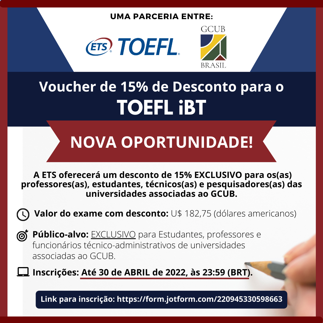 O Núcleo de Internacionalização do Instituto IPÊ informa que o GCUB, em parceria com a Educational Testing Service (ETS), concede nova oportunidade para solicitação de voucher com desconto de 15% para a realização do Exame TOEFL iBT. Esse desconto é exclusivo para professores(as), estudantes, técnicos(as) e pesquisadores(as) das universidades associadas ao GCUB.