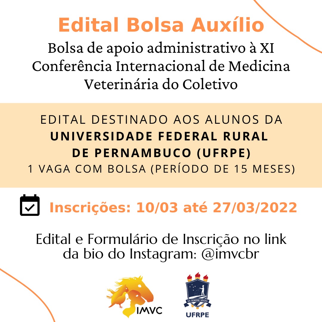 O IMVC, em parceria com a Universidade Federal Rural de Pernambuco (UFRPE), torna público o presente Edital de abertura de inscrições, visando a seleção de candidato à “Bolsa de apoio administrativo à “XI Conferência Internacional de Medicina Veterinária do Coletivo”, para a vigência de 2022/2023. Será concedida 01 (uma) bolsa por um período de 15 (quinze) meses com início em 01 de abril de 2022 e término em 31 de junho de 2023.