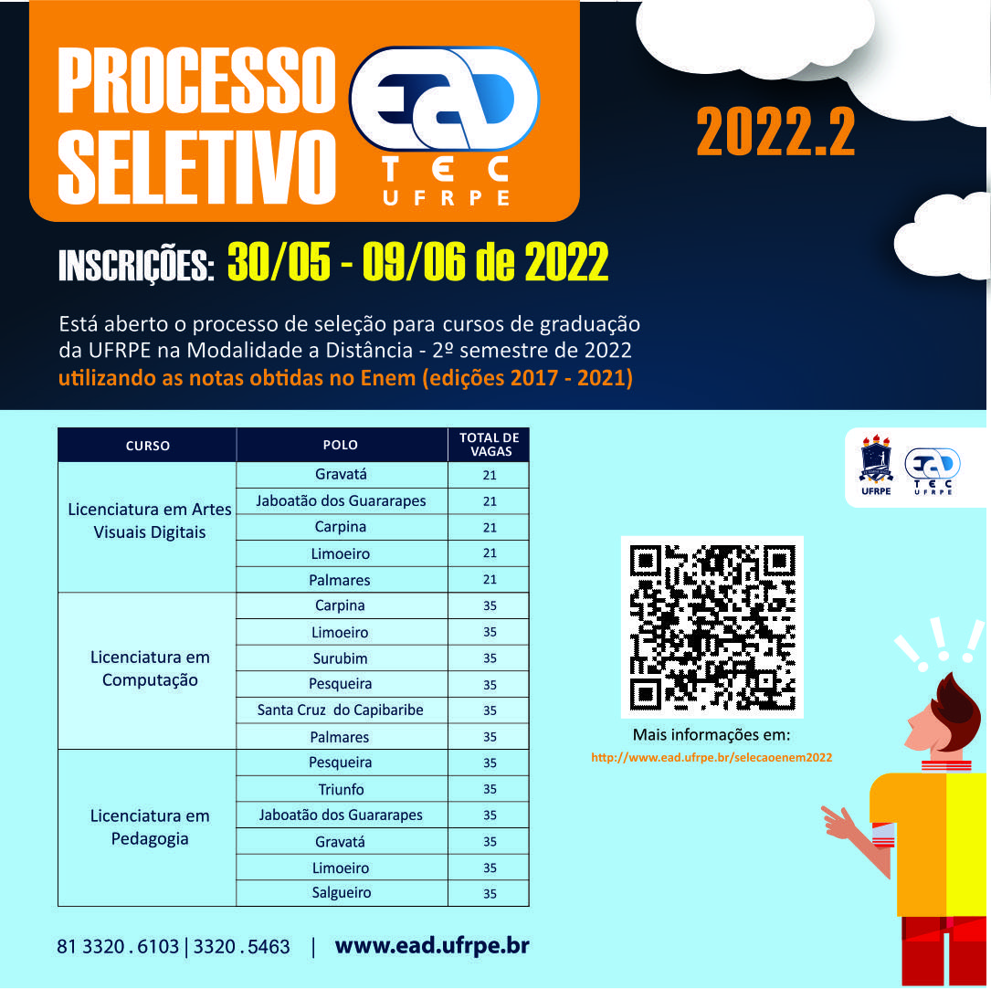 A Reitoria da UNIVERSIDADE FEDERAL RURAL DE PERNAMBUCO – UFRPE, através da Pró-Reitoria de Ensino de Graduação, no uso de suas atribuições, torna público o edital do Processo Seletivo para ingresso de estudantes da Modalidade de Educação a Distância, com as notas do ENEM dos anos de 2017 a 2021, para ingresso no segundo semestre de 2022.2 e cadastro de suplentes nos cursos de Licenciatura em Artes Visuais com Ênfase em Digitais, Licenciatura em Computação e Licenciatura em Pedagogia.