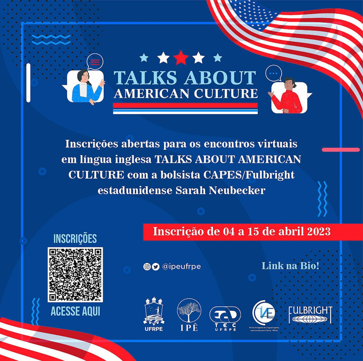 O NINTER/Ipê, em parceria com o NILLE/UAST e a UAEADTec, anuncia que estão abertas inscrições para o TALKS ABOUT AMERICAN CULTURE, encontros virtuais em língua inglesa com Sarah Neubecker, estadunidense bolsista CAPES/Fulbright que atua na UAST. Serão 6 encontros síncronos, através da Plataforma AVA Extensão, mais atividades assíncronas.