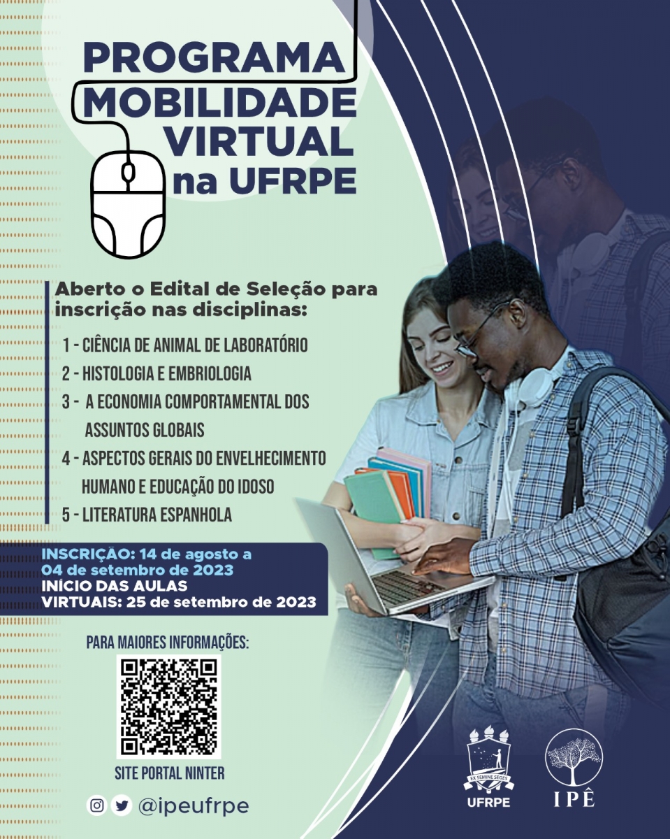 O Núcleo de Internacionalização da UFRPE comunica a abertura do edital para inscrição de candidatos ao Programa de Mobilidade Virtual, com disciplinas ministradas virtualmente em língua estrangeira ou em português, para o próximo semestre, destinado a estudantes de graduação da UFRPE e estudantes estrangeiros.